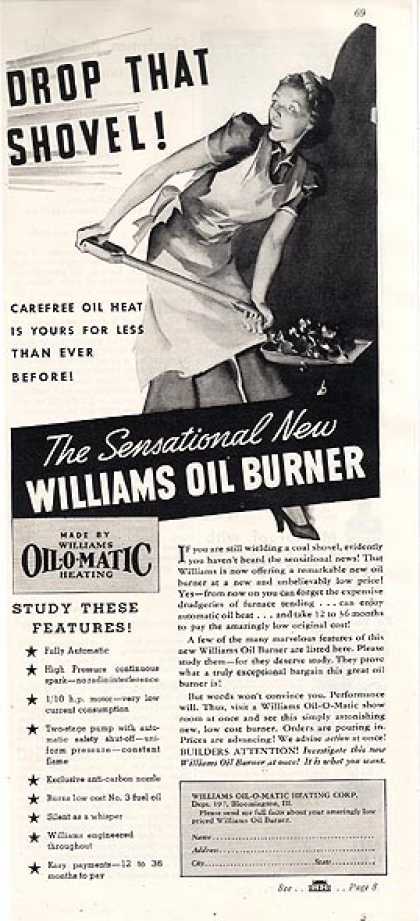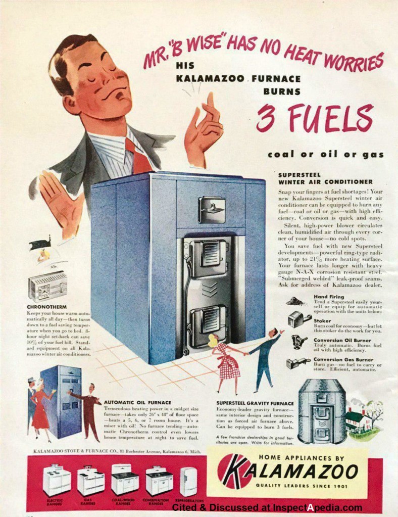 Consumers of home heating often try to nurse their older furnaces or heaters well beyond their utility. It makes sense, as heat from a rickety old oil burner is the same product as warm air from an electric heat pump. It usually takes a massive increase in prices or, more likely, a physical breakdown of the heating system to provoke a change. Of course, this doesn’t stop dealers from trying to sell new systems and promote technical upgrades. This 1948 advertisement, for example offers the flexibility of using three kinds of fossil fuels: coal, oil, and gas; sort of like a bar that hosts both types of music, country and western.